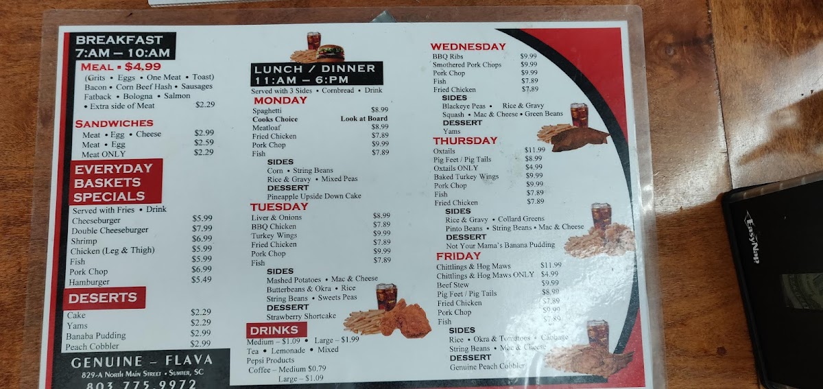Welcome to Genuine Flava, a hidden gem located at 829 N Main St, Sumter, SC. This cozy eatery offers a delightful menu that captures the essence of home-cooked Southern cuisine. With a range of baskets to choose from, such as the mouthwatering Cheese Burger Basket at just $9.99 and the Chicken Basket for $9.99, you're sure to find something to satisfy your cravings.